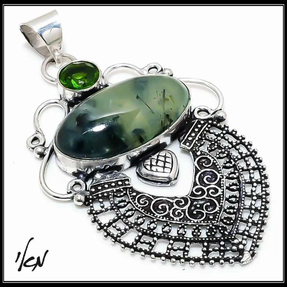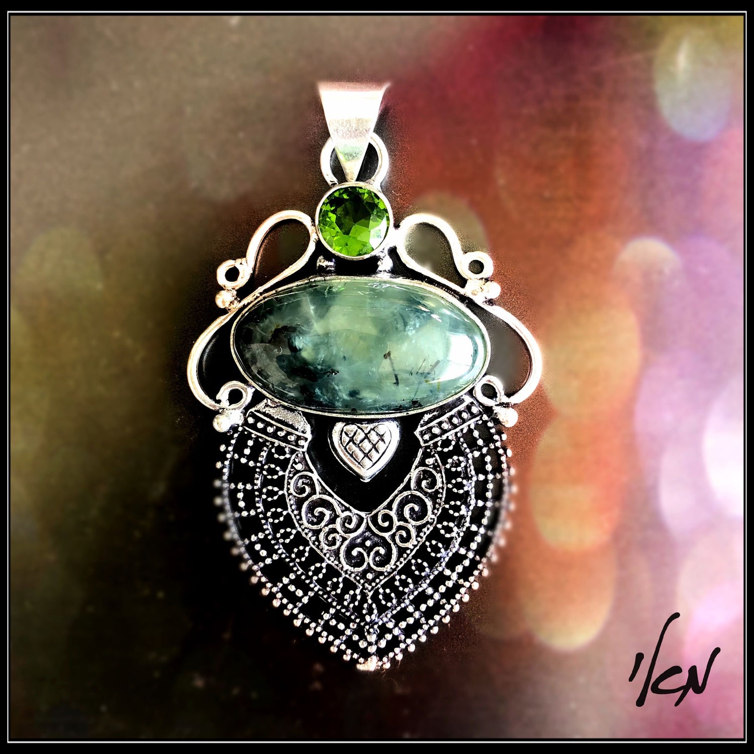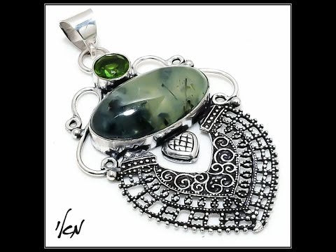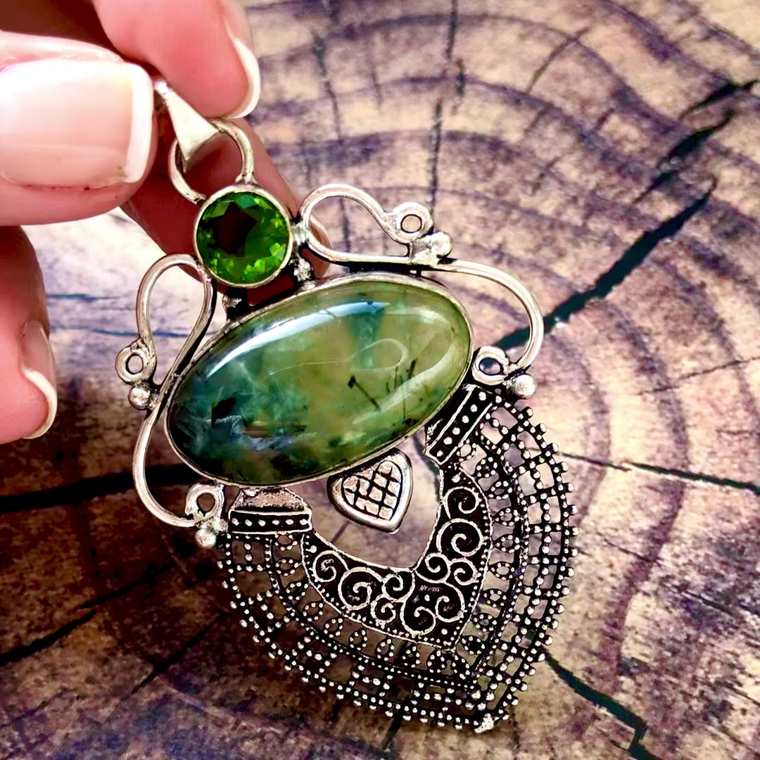 תליון מהמם מכסף טהור 925 משובץ באבני חן פרידוט ופרהניט