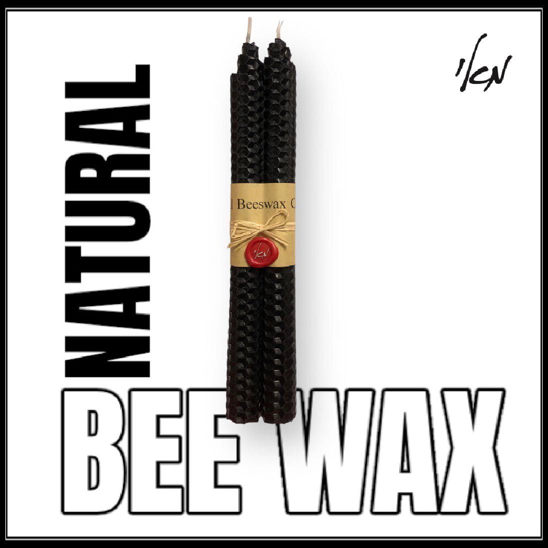 זוג נרות בעבודת יד עשויים שעוות דבורים טבעית בצבע שחור עוצמתי.