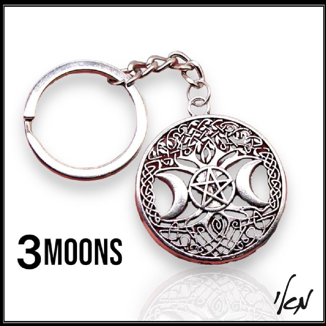 🌙 שלושת הירח – מחזיק המפתחות משלב גם את סמל שלושת שלבי הירח: הירח המתמלא, המלא והמתמעט.